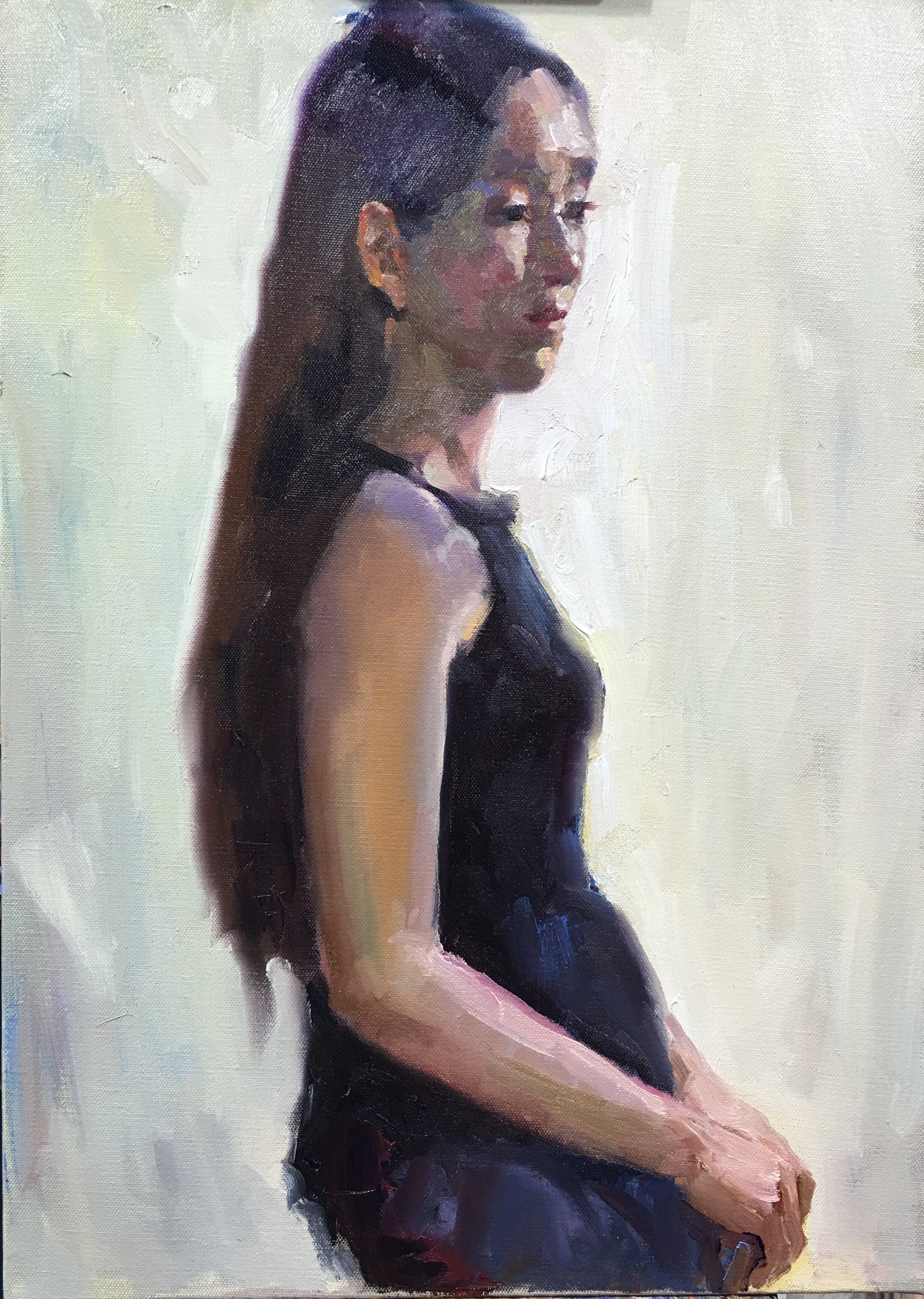 That day my model Irene Mo wore a white T-shirt, looking fantastic at her age. She was in a black pant highlighting her long legs. I was so fall for her beauty and wished to paint a full body pose.