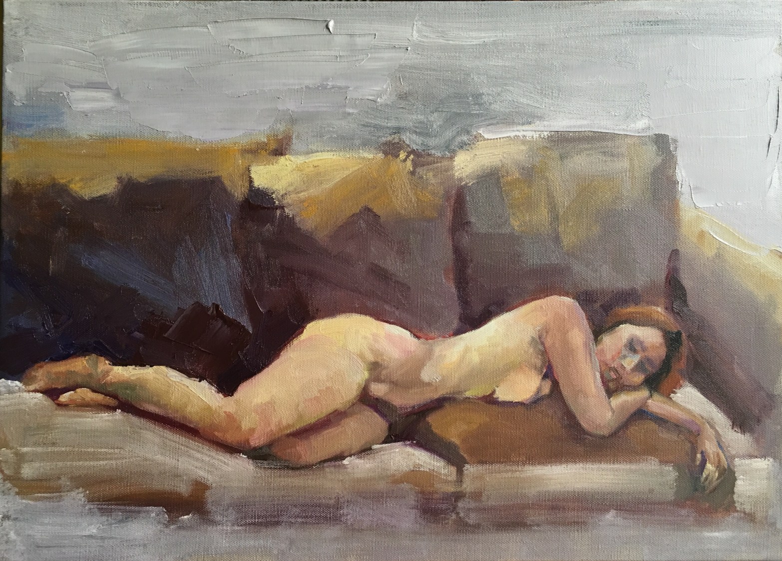 Model was lying on a Russian antique sofa shipped from Milan. She took a nap from time to time. She was a full time theatre writer and actor. An artist herself. She loved swimming and trekking and therefore had a great figure. The morning glow shed on her body presented to us a marvellous female curve. Love it.