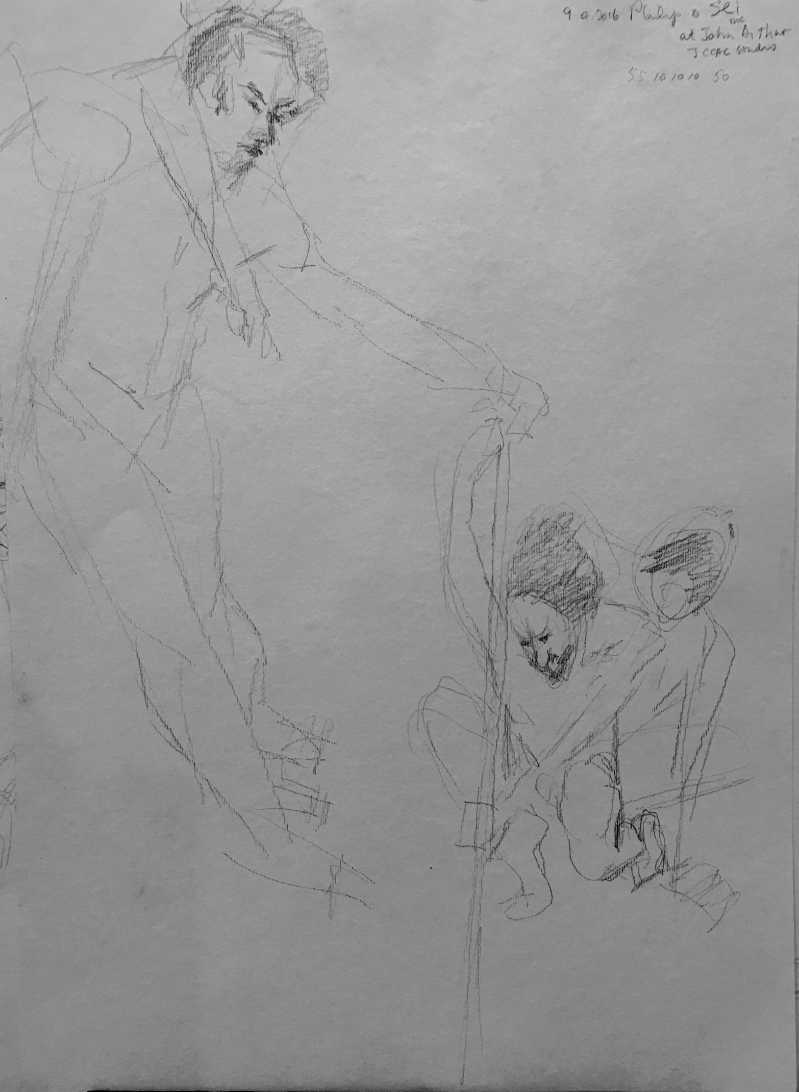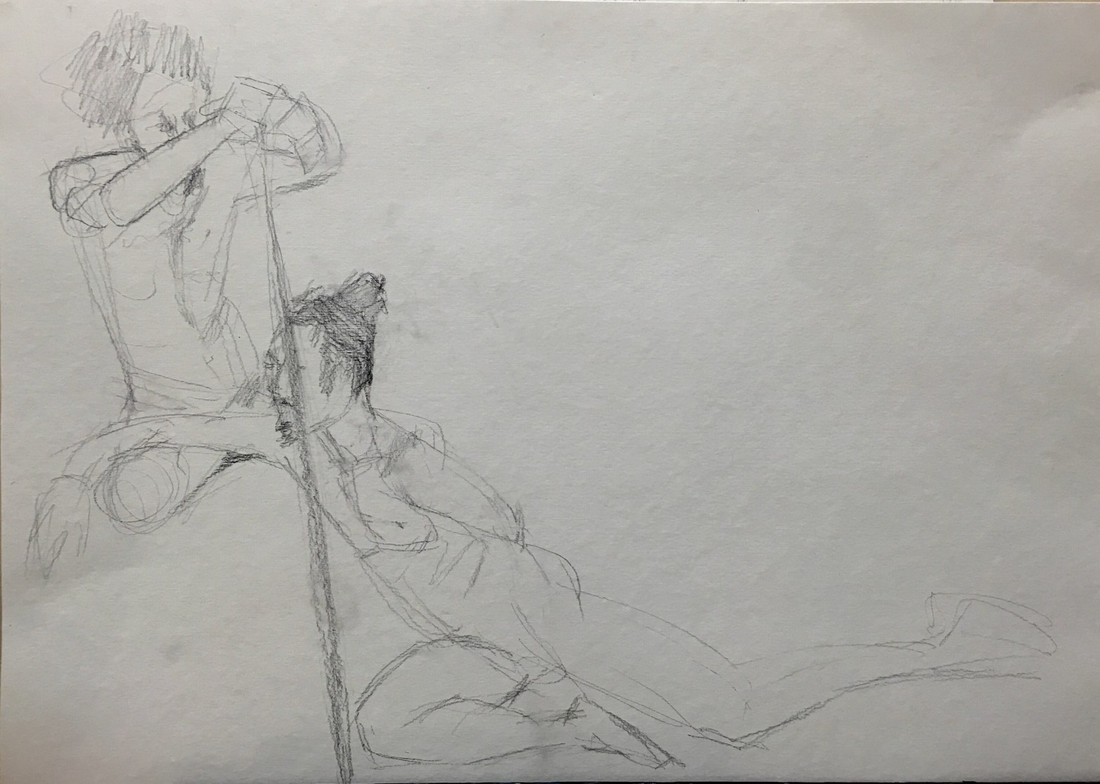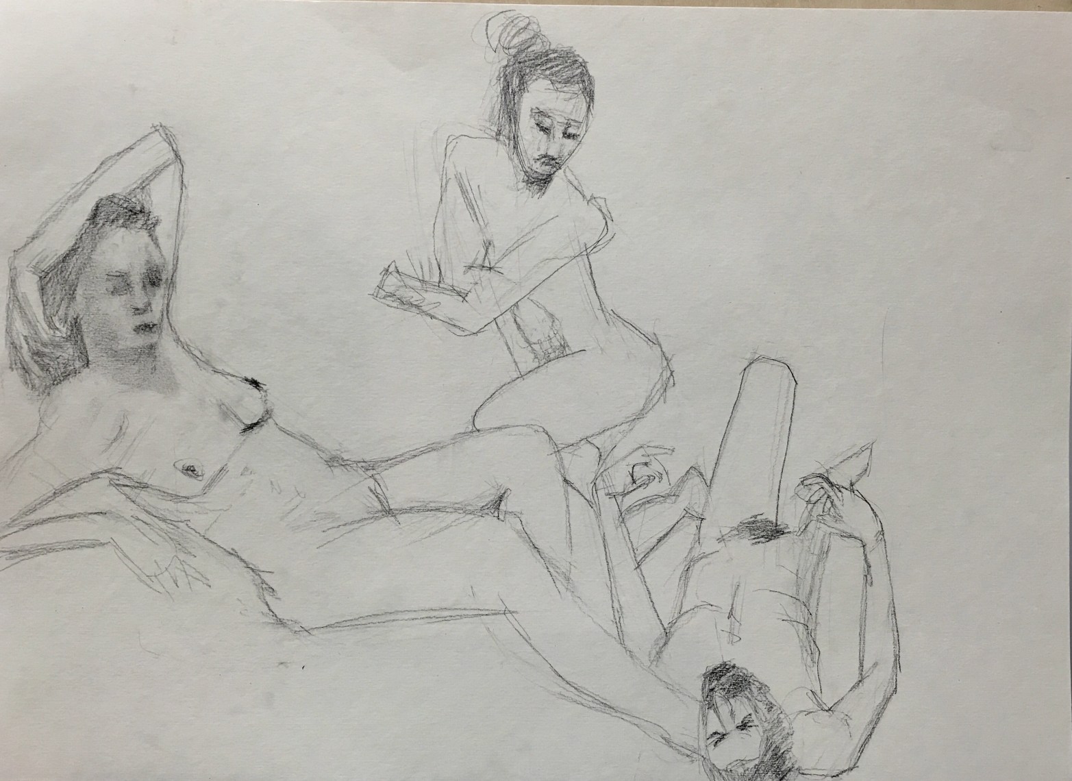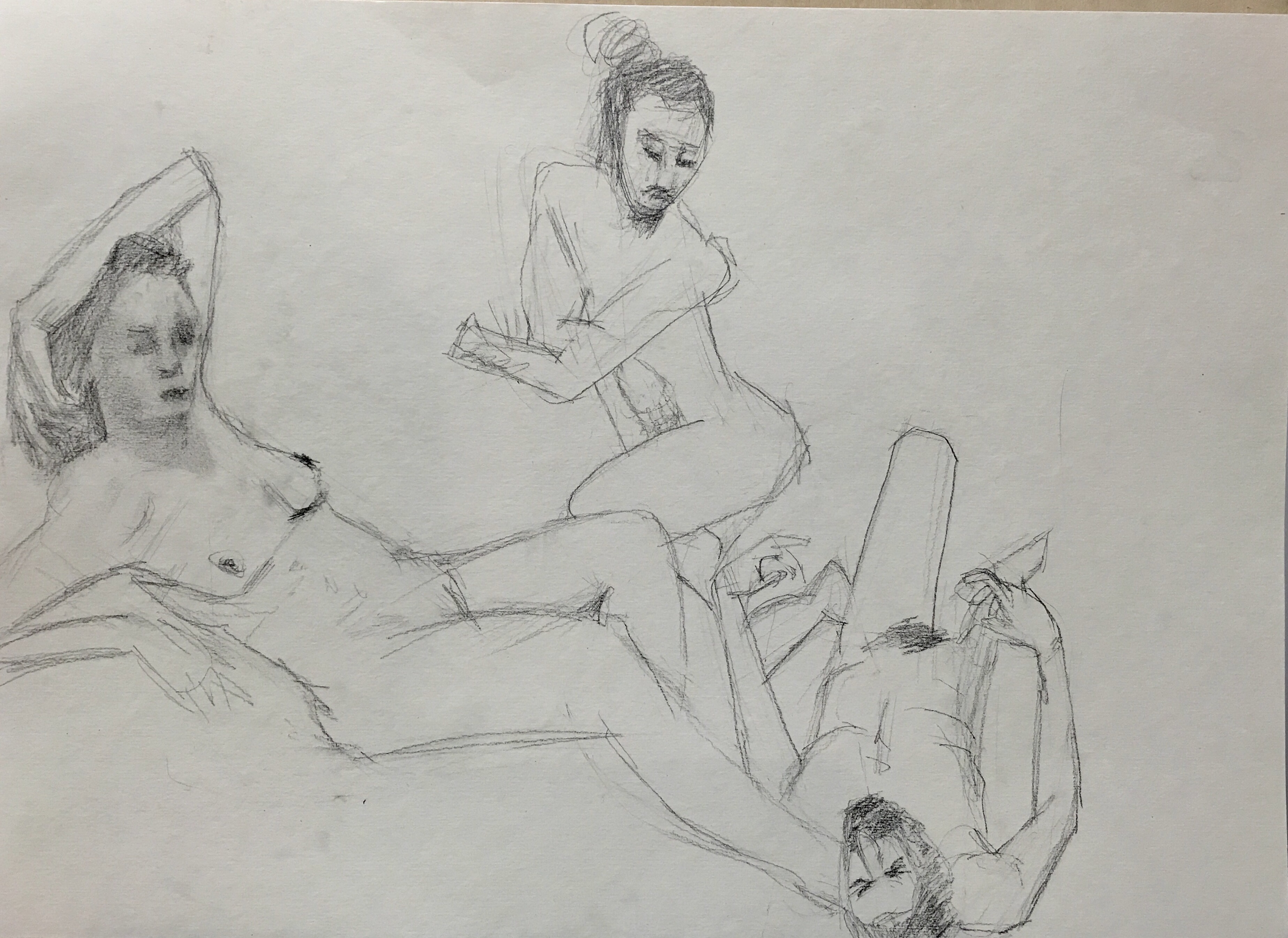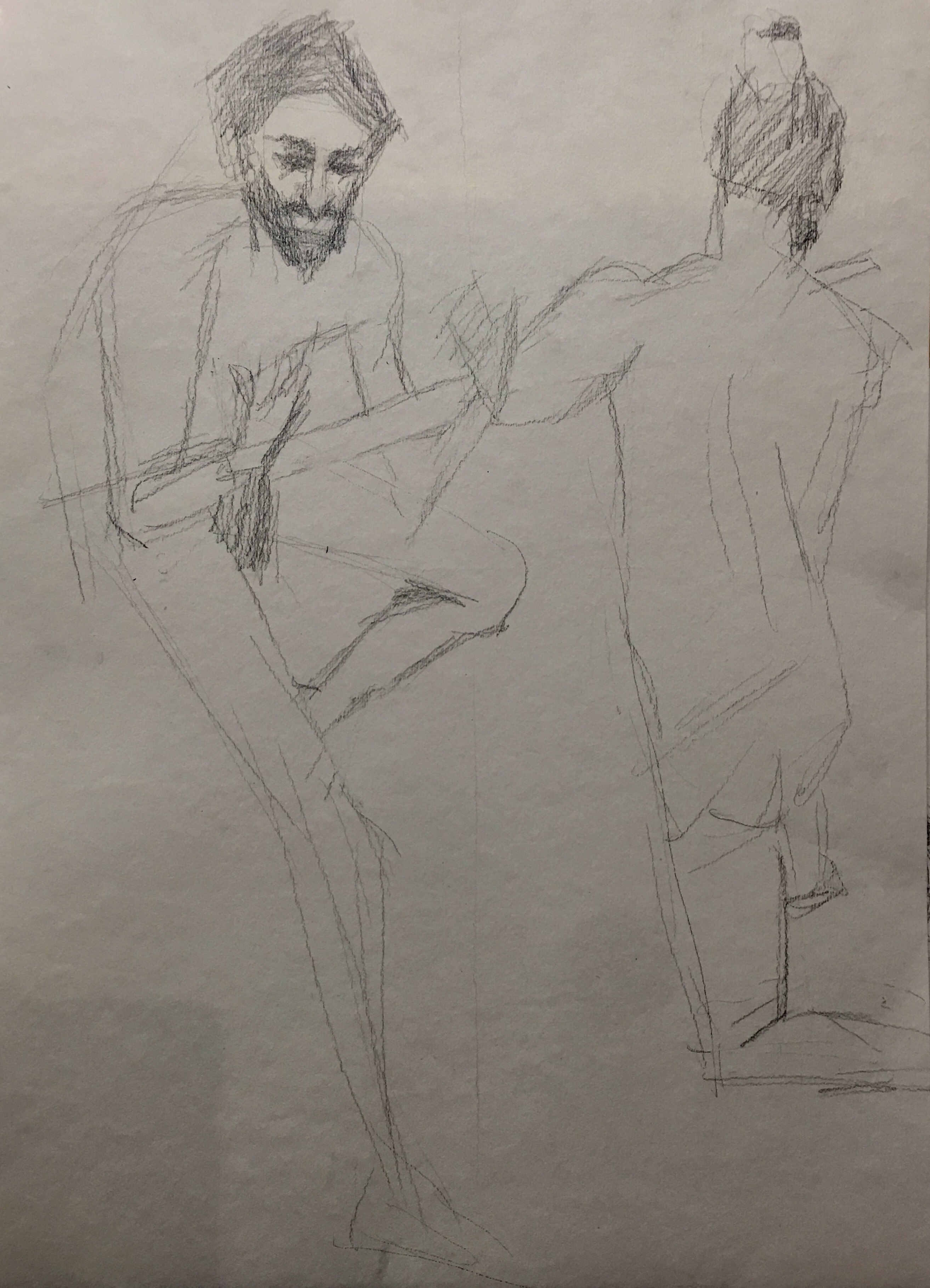 I had been trained for 9 months to draw long pose like 2 to 4 hours each pose. But the people here were more into short causal sketching. That would mean slow motion, 1 min, 2 min, 5 min, 10 min poses. For 3 people it was really challenging.